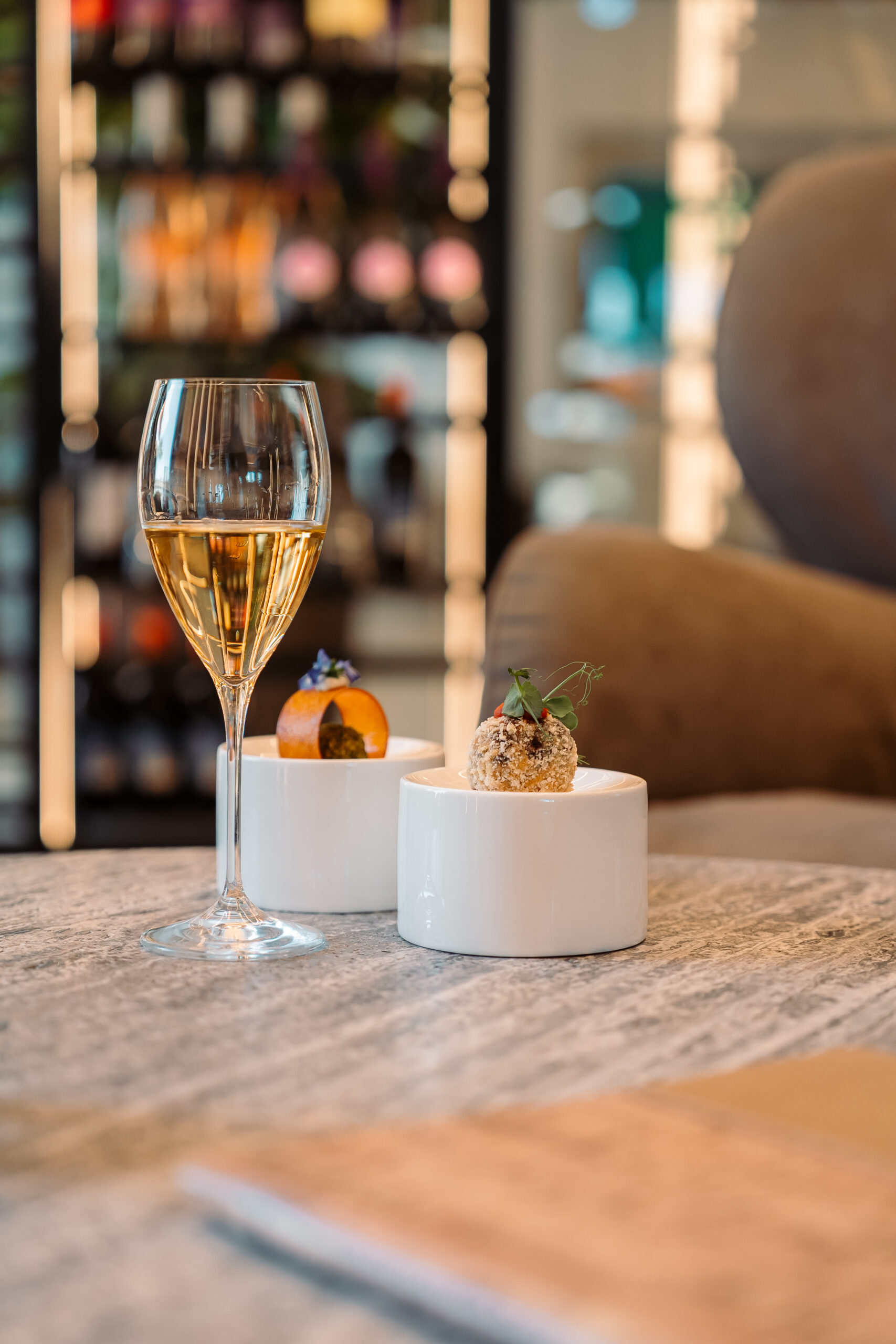 All’ingresso, una prestigiosa cantina di vini ti accoglie con una selezione ricercata, perfetta per accompagnare ogni momento.